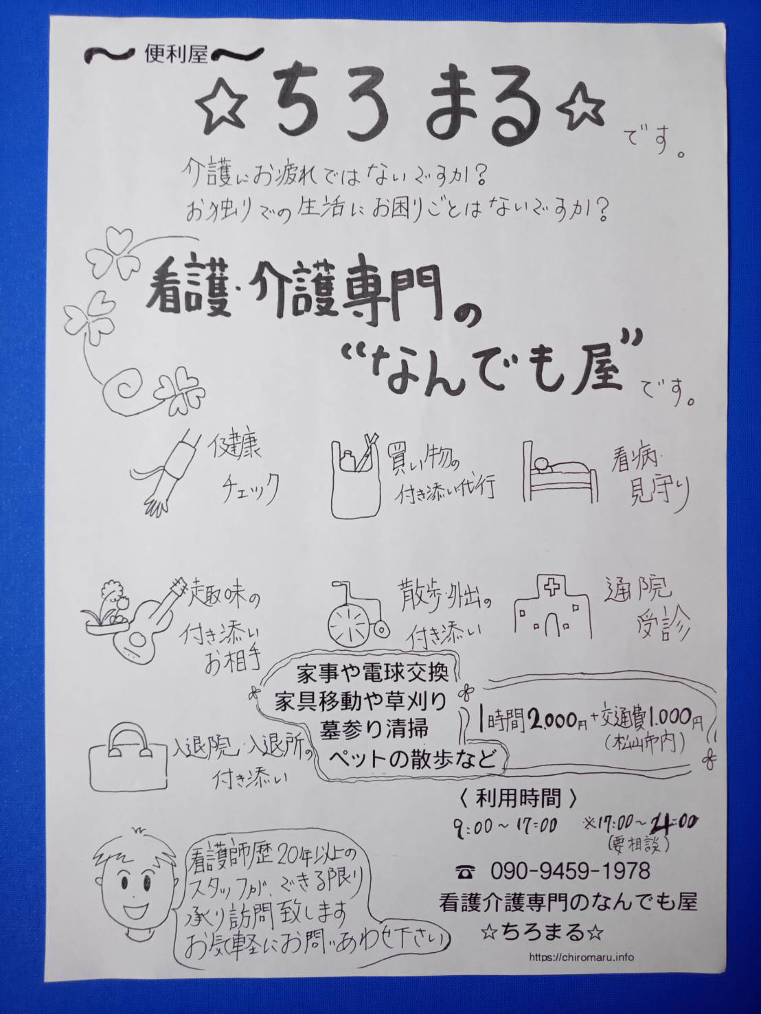 松山市を中心に東温市、砥部町、松前町、伊予市でお手伝いさせて頂いております看護介護専門のなんでも屋☆ちろまる☆です。